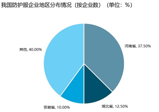 市场调查公司从防护服企业地区分布情况来看,河南省为我国防护服生产制造最大的省份,企业数量约占全国的37.5%;湖北省约占12.5%,安徽省约占10.0%。