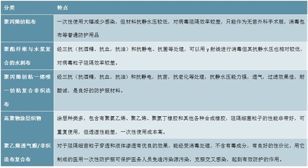 医用防护服主要用于隔绝细菌、病毒的感染,目前市场常见的医用防护服主要有有聚丙烯纺粘布、聚酯纤维与木浆复合的水刺布、聚丙烯纺粘一熔喷一纺粘复合非织造布、高聚物涂层织物、聚乙烯透气膜/非织造布复合布五种。1吨高熔指聚丙烯纤维料可生产大约5000套防护服。合格的防护服,人体的汗气可以向外散发,而外面的有害气体和水分却不能侵入。透气性强、防静电、有较佳的防渗透性;在抗多种有机溶剂、酸碱腐蚀的同时,具有较高的耐冲击性。