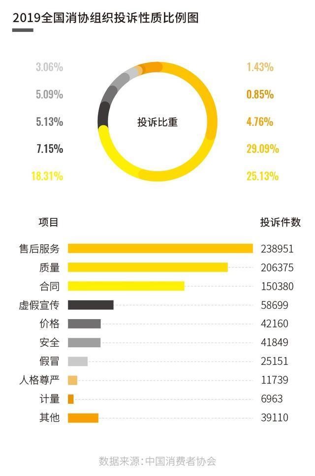 市场调研公司从投诉性质看,2019年,售后服务问题投诉比重占29.09%,质量问题占25.13%,合同问题占18.31%,三者合计占投诉总量的七成以上,是引发投诉的主要原因。其中,售后服务问题位居首位,体现出消费升级后,消费者对商品和服务质量的关注度提高、期待值增强。