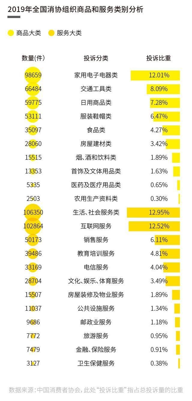 市场调研公司从消费投诉大数据显示,与2018年相比,2019年全年消费投诉数据分析呈现以下特点:预付式消费从健身、美发美容、洗车、餐饮进入教育培训等领域,成为维权老大难;服装鞋帽类投诉量居高不下,假冒伪劣产品喜欢“上山下乡”;家用电子电器类投诉量位居商品类投诉第一,山寨维修不容忽视。