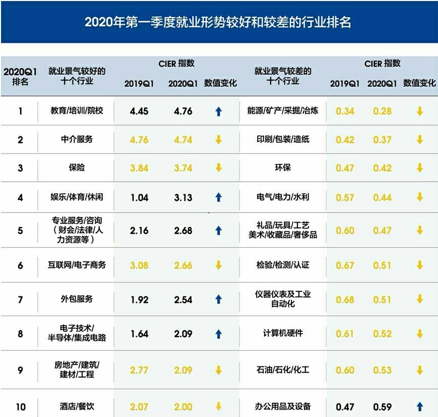 市场调研公司分行业看,2020年一季度,教育/培训/院校行业的排名升至首位,就业形势最好,中介服务行业降至第二位,保险、专业服务/咨询(财会/法律/人力资源等)、互联网/电子商务、外包服务、电子技术/半导体/集成电路、房地产/建筑/建材/工程和酒店/餐饮等行业就业景气也仍相对较好。