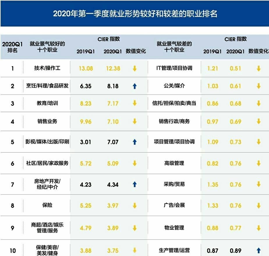 市场调查公司分职业看,2020年一季度就业市场景气指数较高的职业仍为技工/操作工、烹饪/料理/食品研发、教育/培训、销售业务和社区/居民/家政服务等。本季度技工/操作工的排名仍处于首位,CIER指数为12.38。